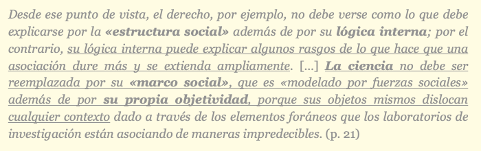 Es decir, como propone Latour ahí (interpretado), la objetividad de las verdades científicas es la manera de explicar precisamente la anomalía de la estabilidad de la estructura social interna y cogenérica (no subgenérica) que las ciencias tienen frente a otras asociaciones.