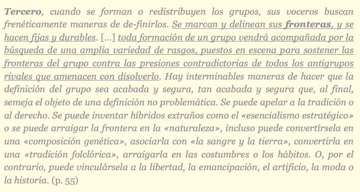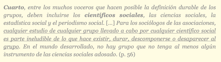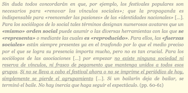 Los grupos sociales no tienen una «inercia social», ni una reserva de «fuerzas sociales», ni un «orden social» estable que pueda estar «representado» en acciones determinadas, ni tampoco se «reproducen» a sí mismos.