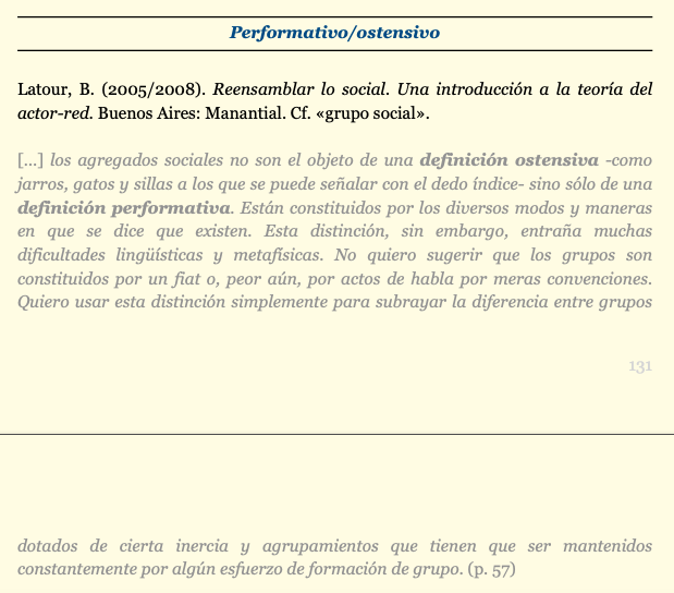 Los grupos sociales son «performativos», no «ostensivos». Esto significa que su recurrencia depende del esfuerzo continuado de los actores, que no son cosas ya dadas que se puedan señalar con el dedo (ergon) sino más bien procesos inestables de asociación (energeia).
