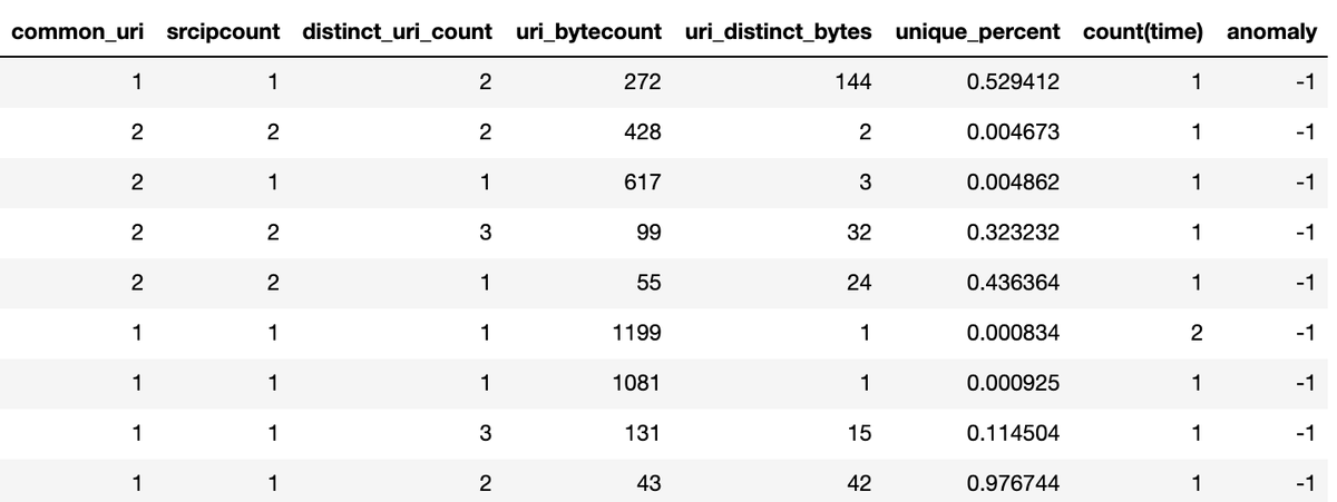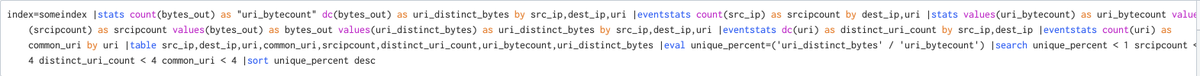When I review the output of this search I generally look for entries where the unique percent is > 90% and the uri_bytecount is ~40. The 40 translatess to 40 commands issued in an hour.