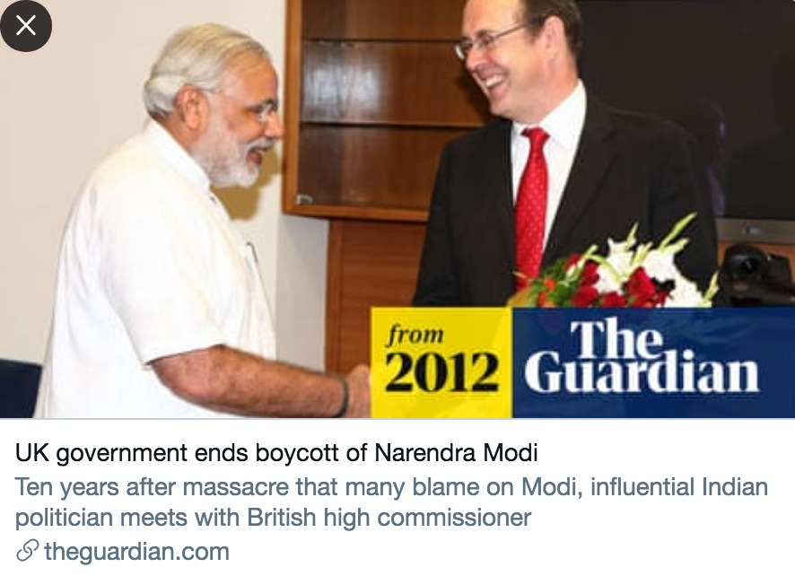 Current PM Narendra Modi was once banned from the UK for his role overseeing massacres of Muslims as head of Gujarat state.