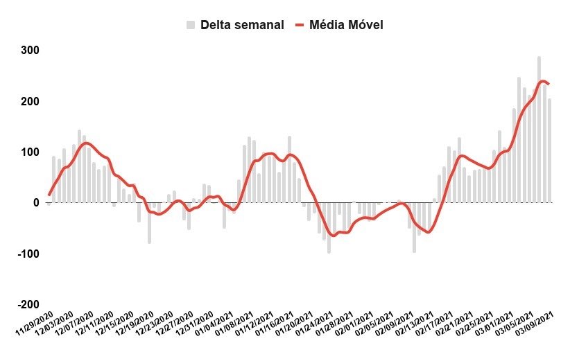 Para terminar do município, veja o delta semanal de leitos ocupados, é o melhor resumo de como a velocidade de ocupação é assustadora.