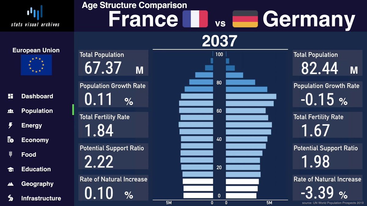 Bu teorilerini de demografiye dayandırıyorlar, Fransa'nın nüfusunun sonunda Almanya'nın nüfusunu aşacak ve Fransa, 2050 dolaylarında Avrupa'daki liderliği yeniden ele geçirecekti! Ancak 2015 göçmen krizinden bu yana, Berlin resmi olarak 2060 yılına kadar Almanya'nın yılda