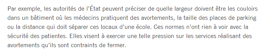 On apprend dans ces articles qu'il est parfois impossible d'avorter légalement dans certains états, tant les restrictions sans lien direct avec le droit sont importantes.