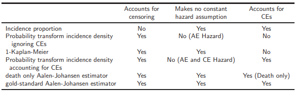 Aalen-Johansen is only estimator of P(AE) that accounts for censoring, CEs, and makes no constant hazard assumption --> can be considered gold standard.