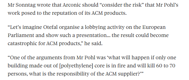 He says Arconic should consider switching to more fire retardant panels only. They of course don't and in 2017 the fire at Grenfell Tower, fitted with their cladding, kills 72 people