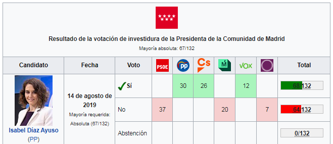 Esta fue la votación de investidura de Díaz Ayuso en 2019. Como verán, Cs es una fuerza absolutamente necesaria para constituir una mayoría, sin Cs, Díaz Ayuso se queda sin mayoría.