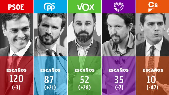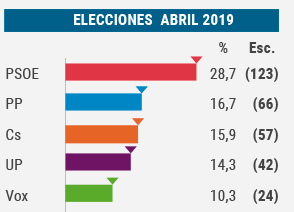 En las elecciones de abril de 2019 da el batacazo y se coloca en el 3er lugar, a menos de un punto del 2do, que era el PP.