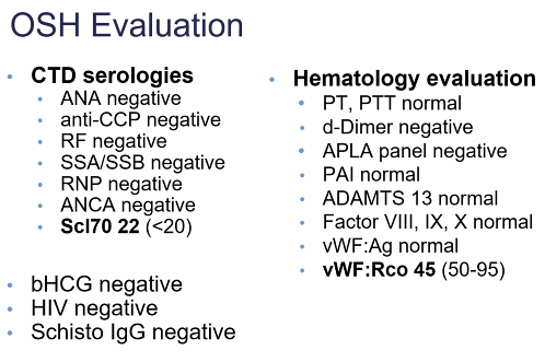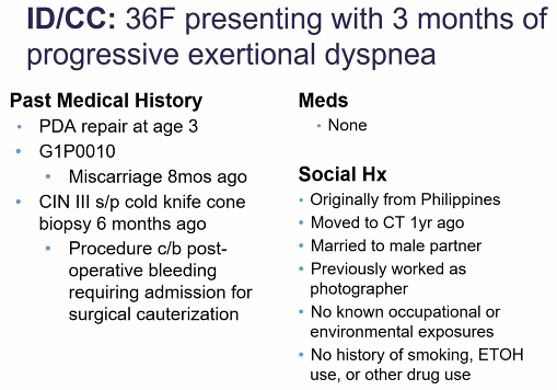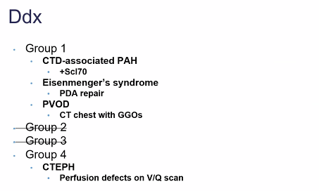 In summary: 36W with subacute worsening dyspnea on exertion, CT with mosaic attenuation, significant RV hypertrophy and dilation, VQ scan suspicious for CTEPH but PAgram negative, RHC with severe pre-capillary PH - mPA 90, PCWP 9, serology notable for slightly low vWF, weak + Scl