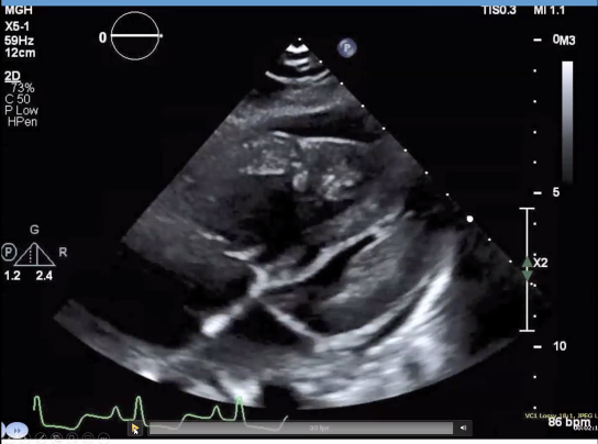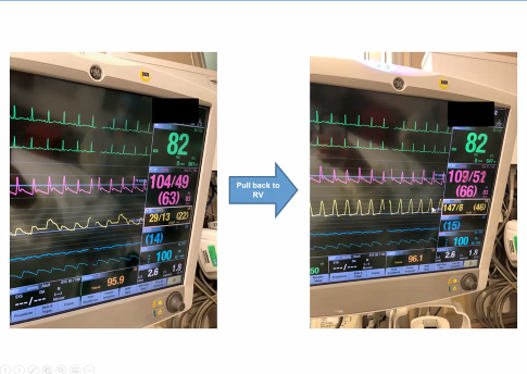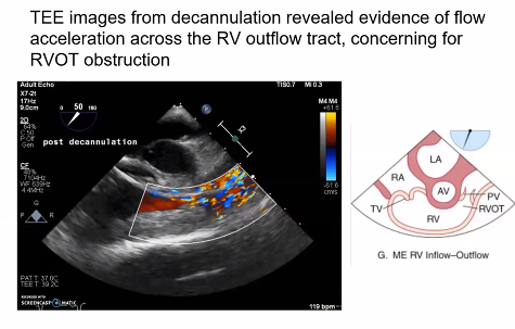 Back to the case: PA pressures as below, and TEE performed with concern for RV outflow tract obstruction