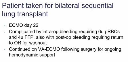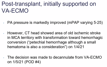 Unfortunately post-transplant, the patient had hemorrhagic conversion of a known ischemic stroke, so was decannulated from VA ECMO on POD#4.