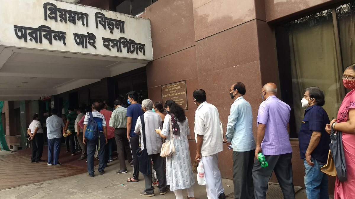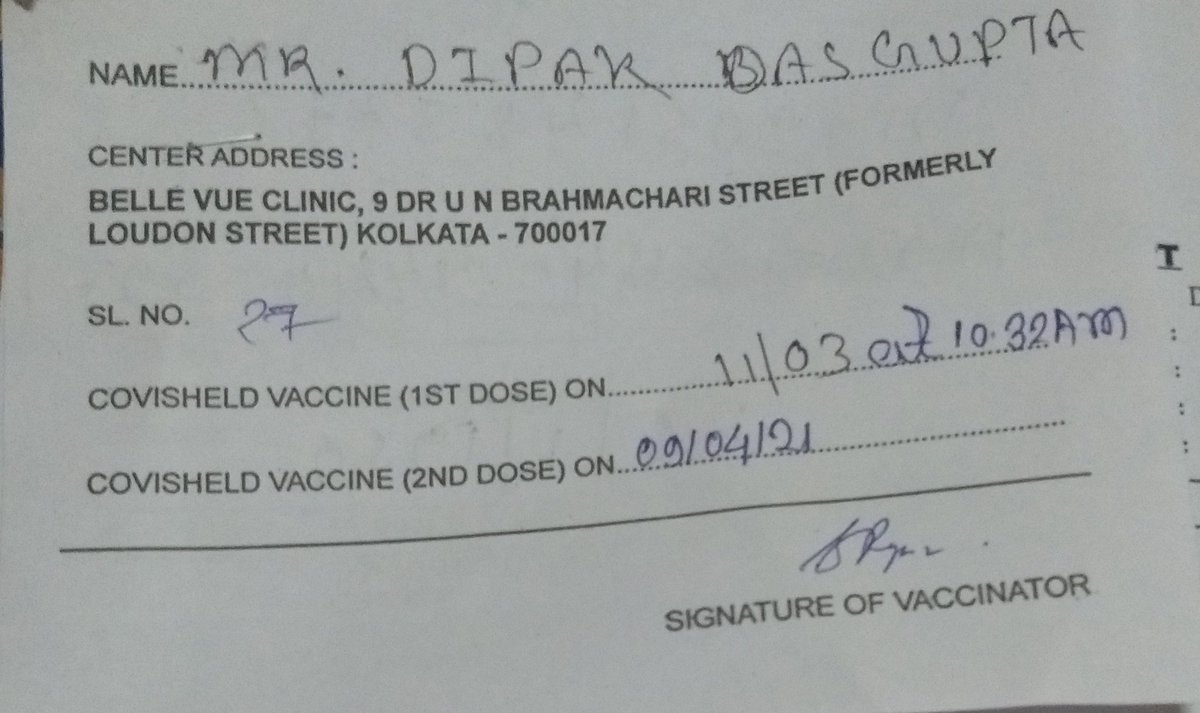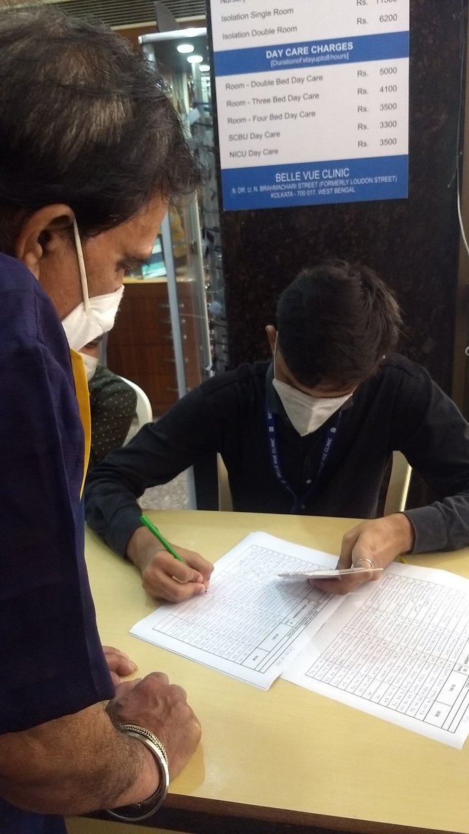 Arrived at Belle Vue clinic, Kolkata at 7:45 am. Appointment at 8 am via CoWin but we heard it's first come first served irrespective. About 10-15 people ahead of us. So far so good...HEY NO CUTSIES! Blue shirt's dad, armed with Aadhar.