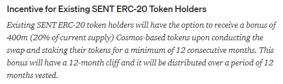 But this is still not enaugh! Existing $SENT ERC-20 token holders will have the option to receive a bonus of 400m (20% of current supply) Cosmos-based tokens upon conducting the swap and staking their tokens for a minimum of 12 consecutive months. The mainnet will be awesome! /4
