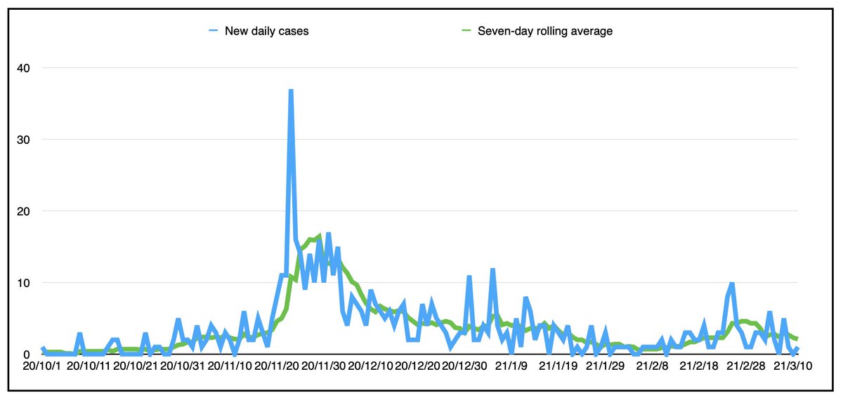 Here is the graph of daily new cases and the 7-day rolling average (today at 2.1):