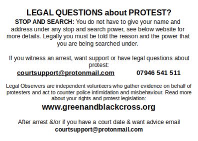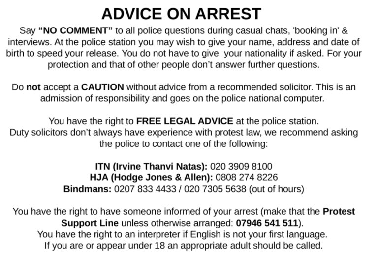 Got legal questions, witness an arrest or police violence or get arrested yourself? Make sure to call the Protest Support Line for tips & support at 07946 541 511 (write this number on the top of your arm under a sleeve)