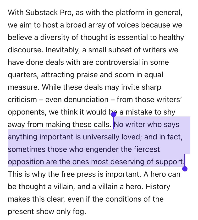 @hamishmckenzie@SubstackInc@sadydoyle I urge @SubstackInc to rethink this “we’re only a business and a platform, we don’t make editorial decisions” position, because when you start choosing who you want to write advances to, you are choosing who you want to support, and making de facto editorial decisions.