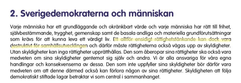 Underskatta aldrig borgerlighetens naivitet gällande fascismen. Man tror sig konstant kunna alliera sig med den, kontrollera den. Minns SD:s program: ”Ett alltför ensidigt rättighetstänkande kan dock vara destruktivt för samhällsutvecklingen.” dn.se/ledare/lisa-ma…
