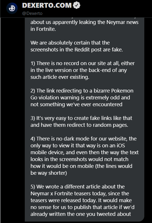 5 - They wrote a different article about Neymar x Fortnite today talking about the teasers, so it wouldn't make sense to publish two Neymar articles back to back.