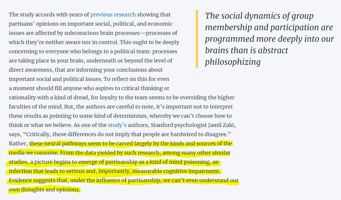 4. These neural pathways seem to be carved largely by the kinds and sources of the media we consume. From such research, a picture begins to emerge of partisanship as a kind of mind poisoning, an infection that leads to serious and measurable cognitive impairment.