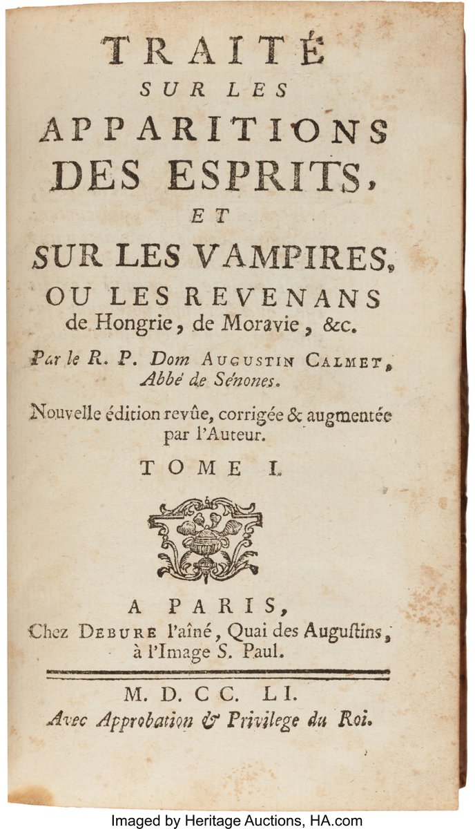 En él, Calmet recoge y filosofa sobre muchos casos de supuesto vampirismo, especialmente de “revenants”, "retornados", muertos que vuelven de sus tumbas para atormentar a los hombres. Hay que decir que esta creencia en vampiros estuvo bastante extendida a lo largo de aquel siglo.