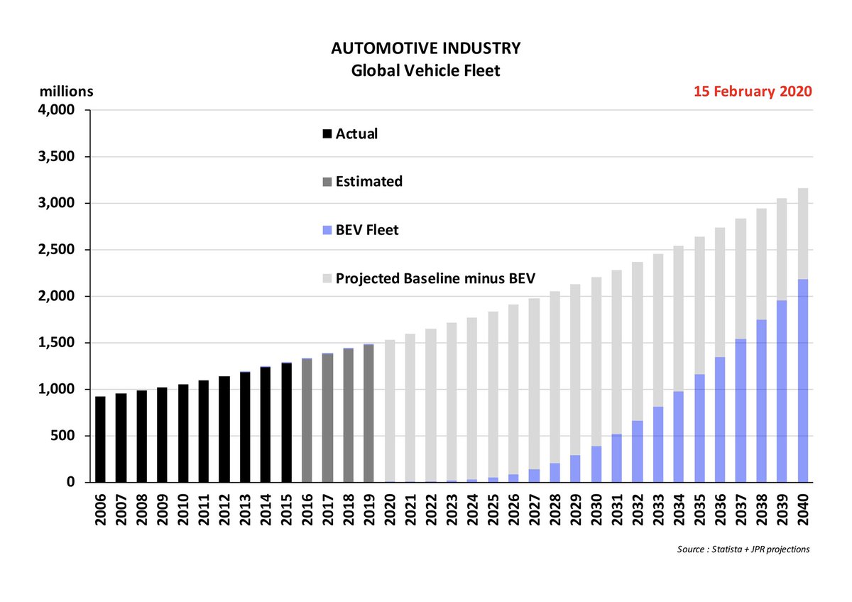 Delivery of only ~600 million BEVs by 2040 in line with Snowbull's forecasts would substantially delay the conversion of the Global Vehicle Fleet from ICEVs to BEVs compared to the ~2,200 million BEVs shown here