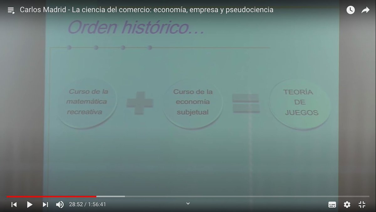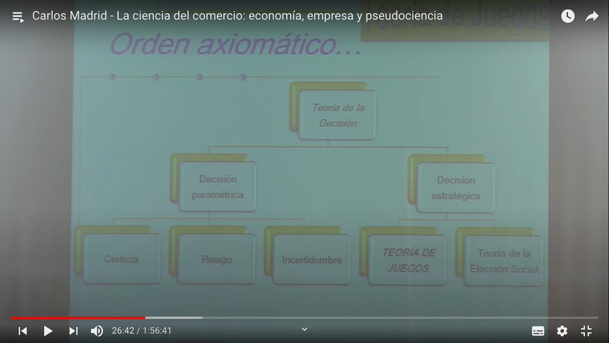 En el minuto 26 en adelante, Carlos Madrid trata la Teoría de juegos y la Teoría de la decisión en Economía: