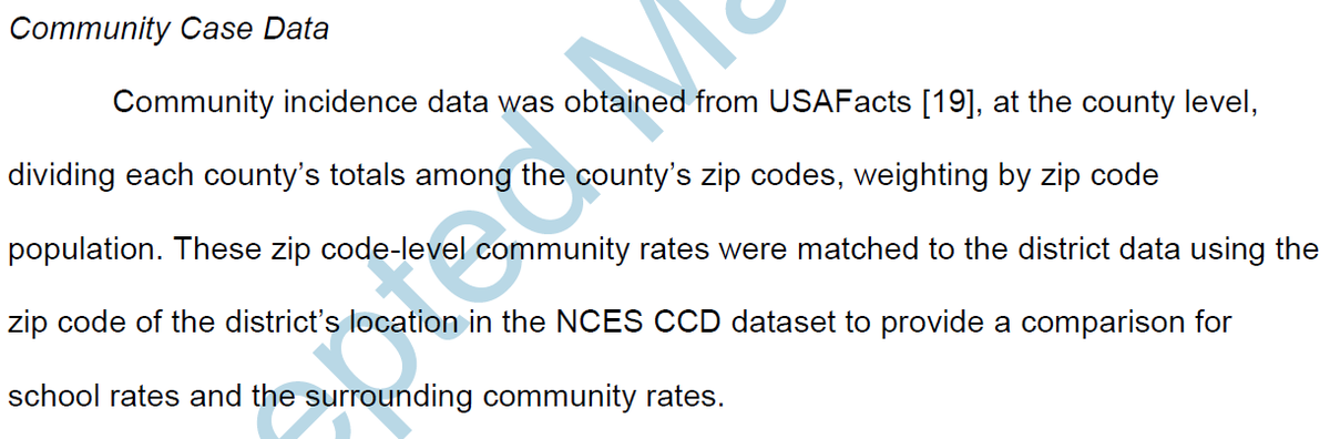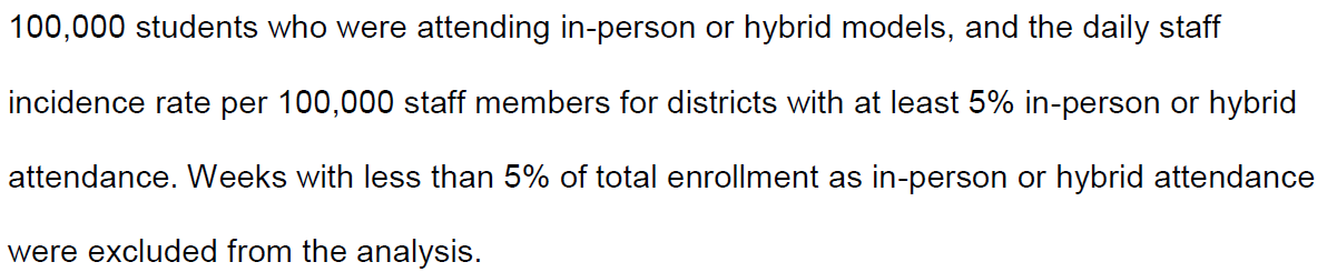 Big issue #2) Focal metric in study is incidence (# of COVID-19 cases reported to state). That's not what we actually care about. We care about # of transmission events in class rooms that have 3' or 6' of space b/w students. Study has 0 data on where infections occurred.