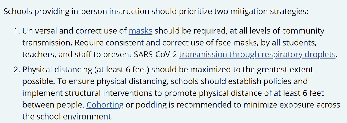 The biggest, most important thing CDC recommended was 6'. Why? Because all public schools can require masks but most (nearly all) CANNOT provide in-person schooling at normal capacity & provide 6' space b/w students. There simply isn't building space.