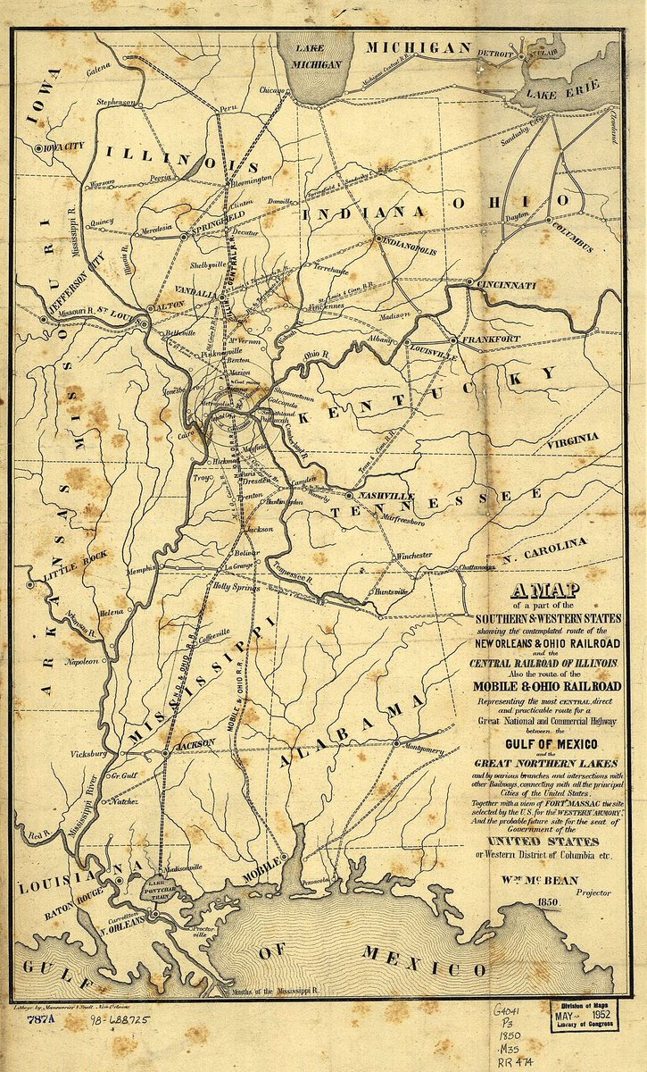 owned land near the terminal in Chicago. Lincoln was a lawyer for the railroad. Upon its completion in 1856, the IC was the longest railroad in the world. Its main line went from Cairo, Illinois, at the southern tip of the state, to Galena, in the northwest corner. A branch line