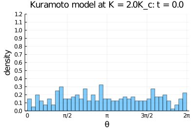 using Distributions, DifferentialEquations, Plots の3つのパッケージを使った自然な10行のコードでKuramoto modelの動画を作れる!