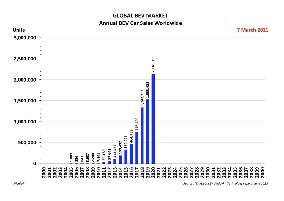 We do not yet have a final total for Global Vehicle Sales in 2020, but preliminary indictions are that 77.1 million vehicles were sold of which 2.1 million or 2.7% were pure BEVs