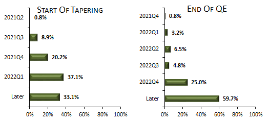 4/5 Respondents seem to have internalized the #Fed's guidance on QE a lot better. Median answer is that QE will not be tapered until 2022Q1 and that it will end beyond 2022. This scenario, which is very plausible, would rule out 2022 hikes (no hikes while QE is ongoing).