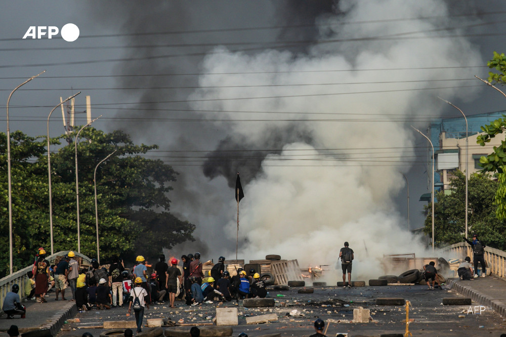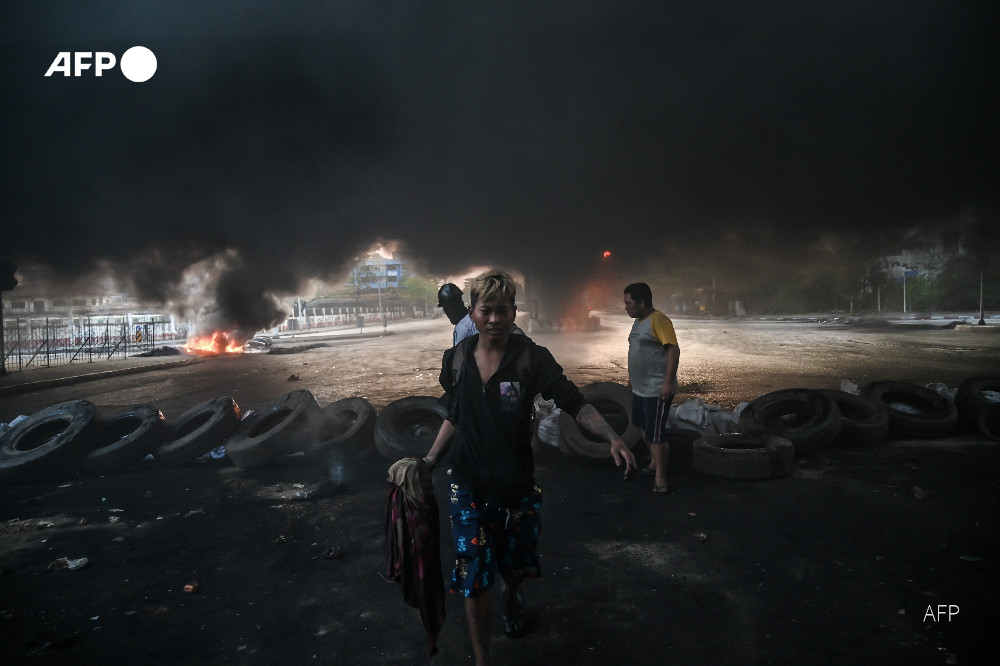 Plumes of smoke are rising above a part of Yangon that has turned into a battle zone, with burning barricades and security forces firing at unarmed anti-coup protesters to enforce martial law