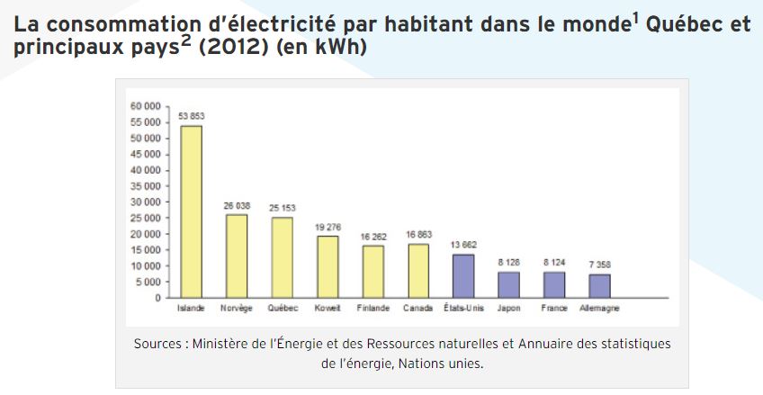 13/Les Québécois sont de GROS consommateurs d’élec : 3e rang mondial après l’Islande et la Norvège. C’est par habitant 3x plus qu’en France. C’est pas cher (4x- qu’en FR), il fait froid et l’industrie électrovore a prospéré (~50% de la consomm).