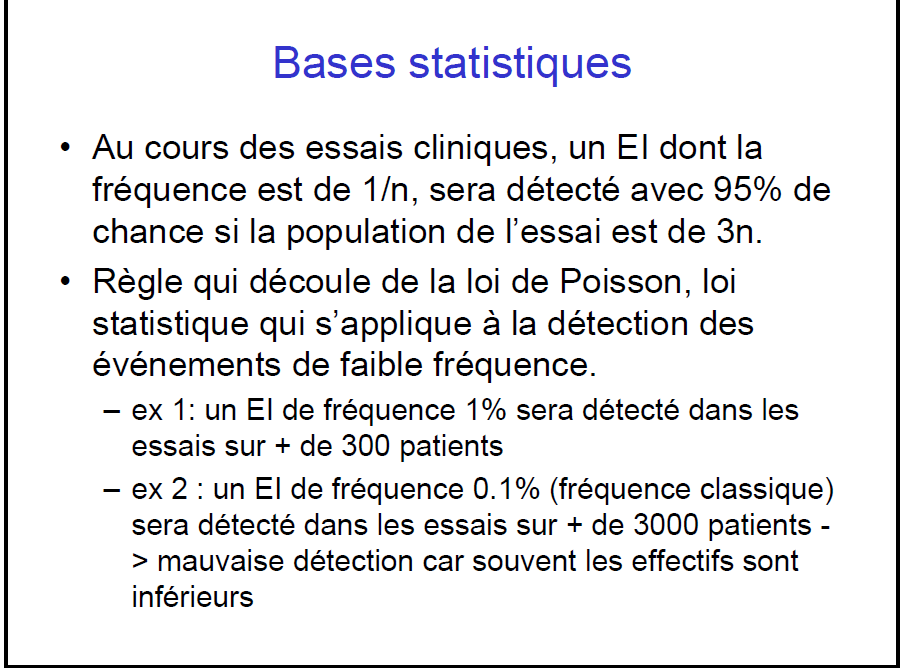 4/n Mais, même si les investigateurs avaient fait preuve de très bonne volonté pour recueillir scrupuleusement tous les effets indésirables, du fait des lois statistiques on ne peut détecter dans un essai clinique des effets indésirables dont la fréquence est < nbr sujets/3