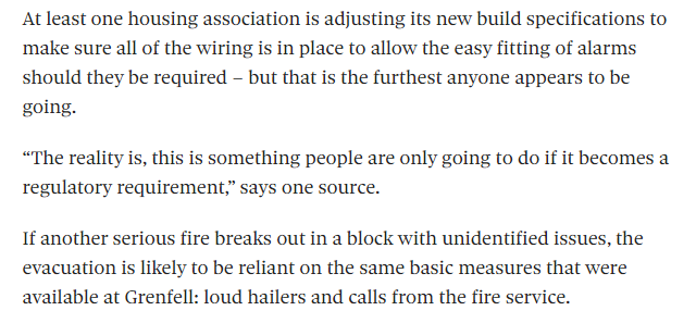 The only commitment in its consultation is that this should be "informed by the outcome of the programme of research and testing". Which is not the same as doing it. High rises are not currently being fitted with alarms unless we KNOW they have defects: