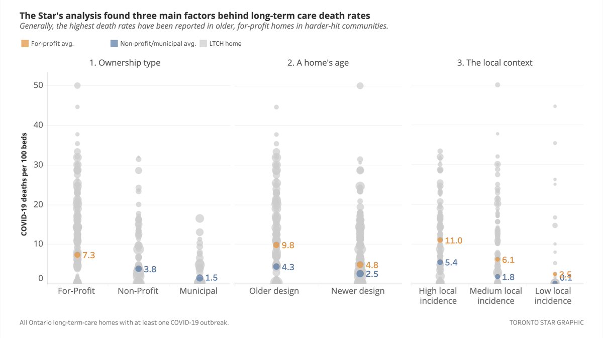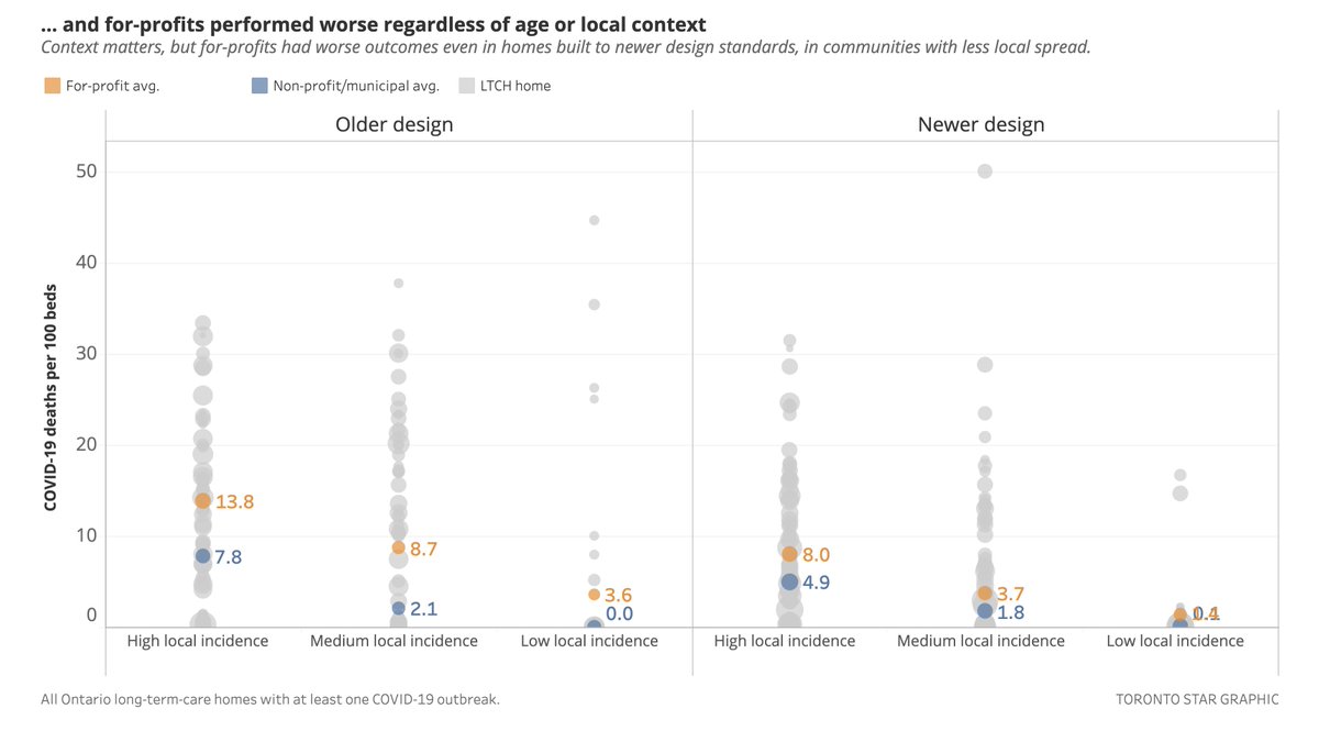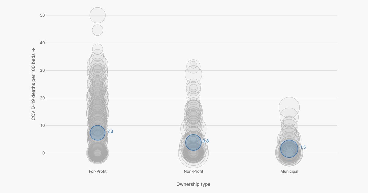 Older or newer, hard-hit cities or no, for-profits saw more deaths per capita across the board.