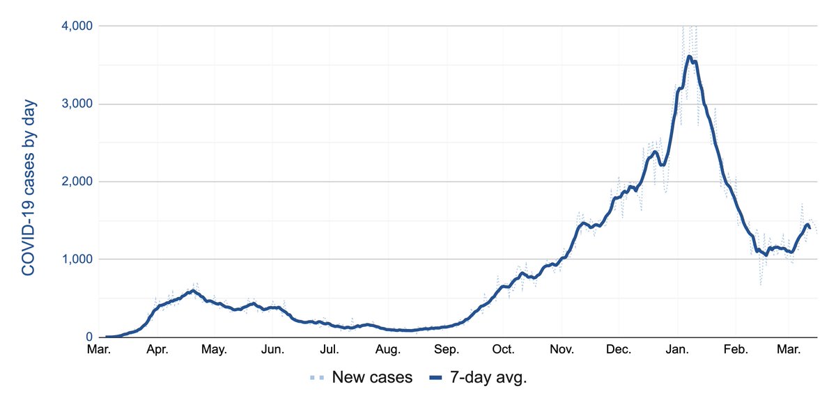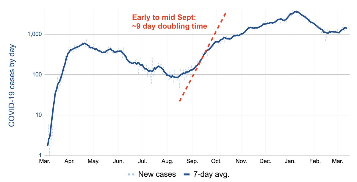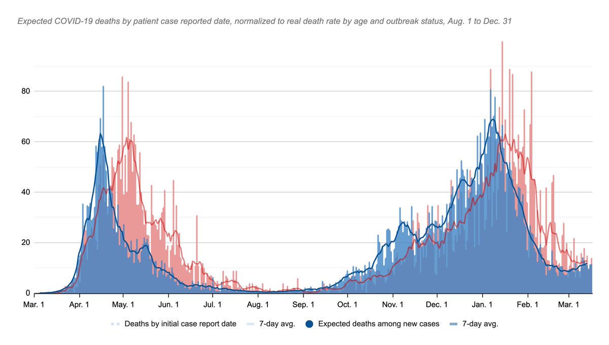 2/n As older people get vaccinated, the mix should avg. less deadly, and you'd expect this blue line to become increasingly disconnected from the overall trend in daily cases.