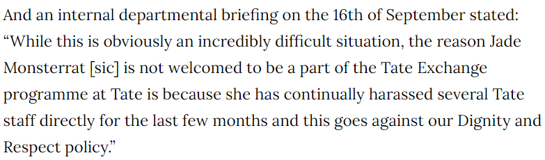 After this Guardian article by @BenQuinn75 was published, Tate bosses claimed the legal situation had changed. Director Maria Balshaw reportedly said she would likely be sacked if Jade was allowed to take part theguardian.com/artanddesign/2…