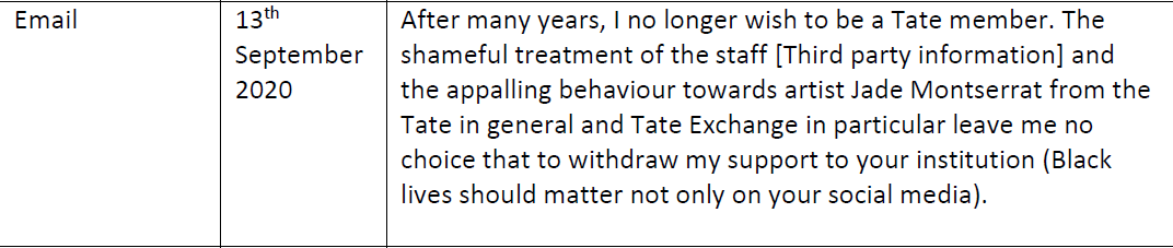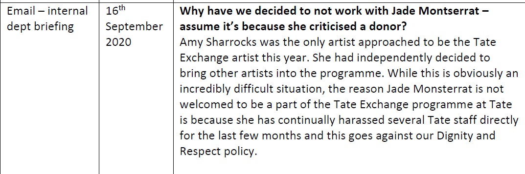 So to sum up: while the Tate was publicly preaching Black Lives Matter, it was privately shutting down criticism by a young black female artist about how it had handled accusations of racism and abuse against one of its key backers.