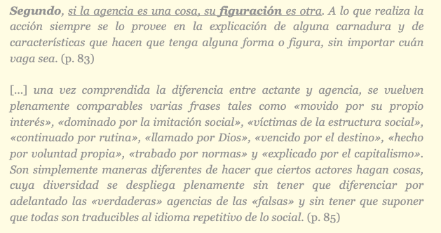 (2) Distingue entre las agencias (materia) y sus figuraciones (su conformación). Todas las agencias (Dios, destino, rutina, capitalismo, normas, voluntad, etc.) son idempotentes («plenamente comparables») para el sociólogo.