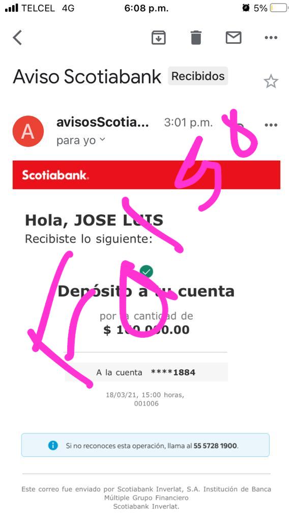 correo a mi esposo de "ScotiaBank" (falso)con un aviso del depósito. Mi esposo sigue en el banco y nada q caía el dinero, yo estaba con ellos en el café y con los papeles, regresa y le enseñan la foto de la "ficha de Depósito", y baja de nuevo al banco, el cajero llama por...