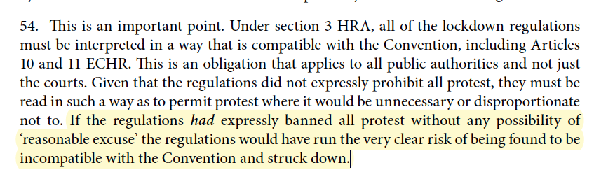 This is just wrong - legally. Protest has not been banned in total under the current lockdown. See the judgment of Mr Justice Holgate in the @ReclaimTS case from last Friday. Should be published this afternoon