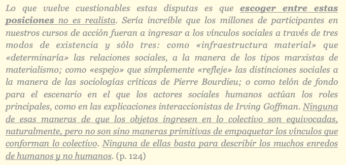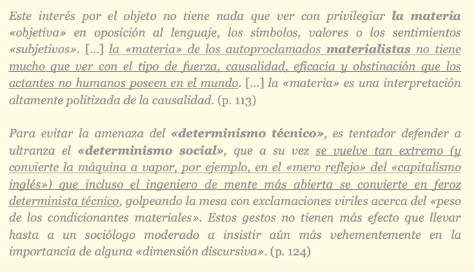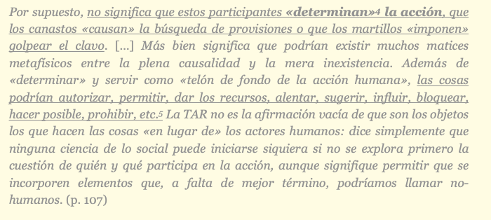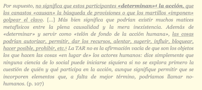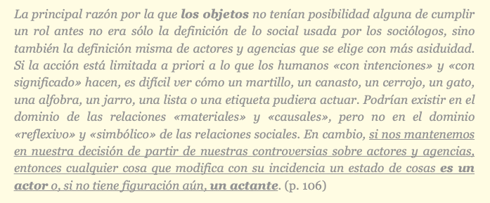 sí la ejercitan en sus explicaciones. Los objetos no son simplemente «instrumentos» que los actores usan para satisfacer sus «intenciones» o para «dotarlos de significado», sino que estos objetos «modifican» el «estado de cosas» [son indisociables de la propia racionalidad de las