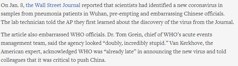 "After the article, state media officially announced the discovery of the new coronavirus. But even then, Chinese health authorities did not release the genome, diagnostic tests, or detailed patient data that could hint at how infectious the disease was."