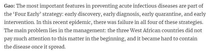 Gao: The most important features in preventing acute infectious diseases are part of the ‘Four Early’ strategy: early discovery, early diagnosis, early quarantine, and early intervention. In this recent epidemic, there was failure in all four of these strategies.