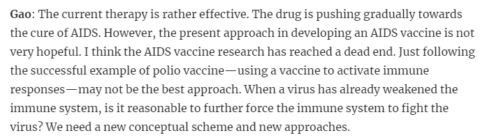 Gao: I think the AIDS vaccine research has reached a dead end. Just following the successful example of polio vaccine—using a vaccine to activate immune responses—may not be the best approach. We need a new conceptual scheme and new approaches.