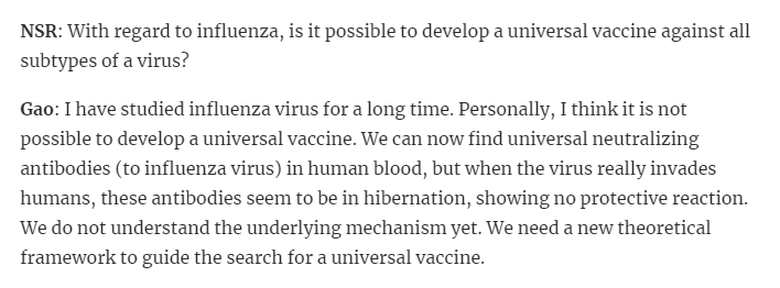 Gao: Personally, I think it is not possible to develop a universal vaccine. We can now find universal neut. antibodies in human blood, but when the virus really invades humans, these antibodies seem to be in hibernation, showing no protective reaction.
