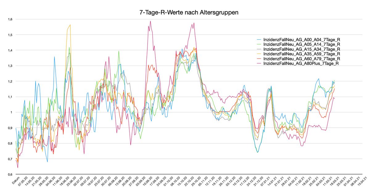 Grundsätzlich ist interessant, wann das "Farbenbündel" sich im Gleichtakt bewegt und wann es sich auffächert und welche Altergruppen "ausscheren" und wann die R-Werte wieder zusammenkommen.