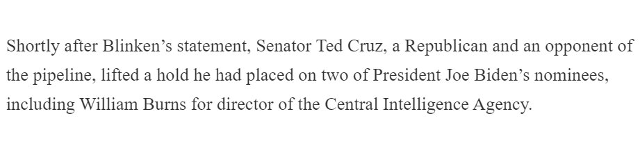 Pemerintah Biden mengancam sanksi untuk Nord Stream 2. Langsung Cruz menarik ketidaksetujuan thd pelantikan 2 org Biden tsb.